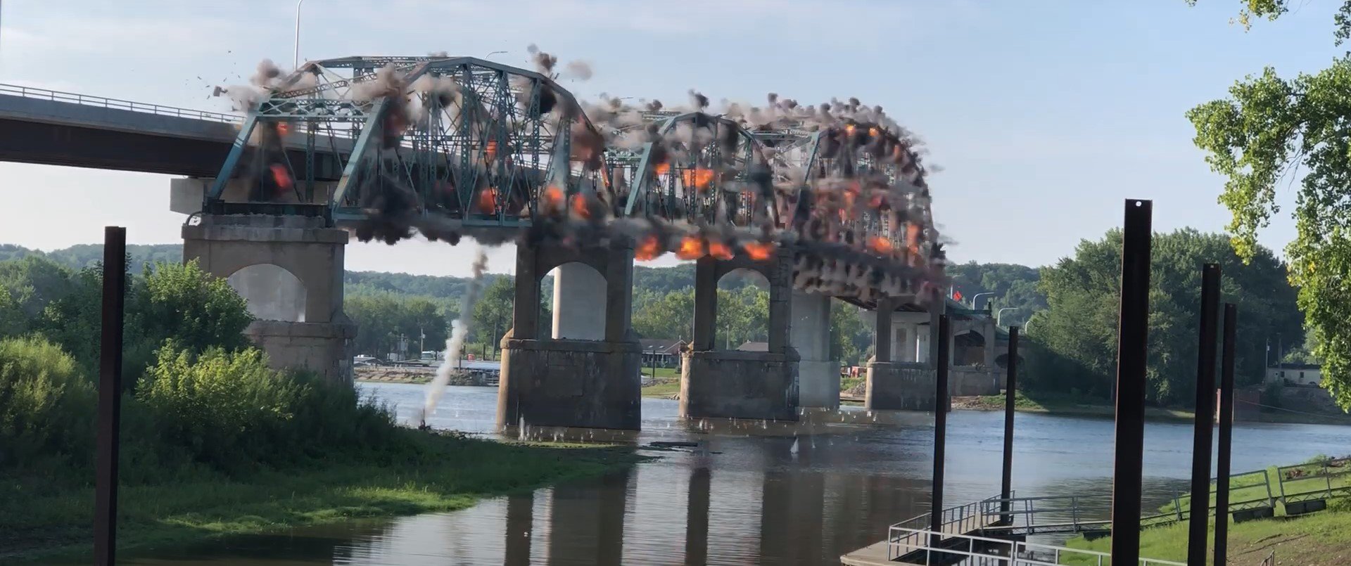 Truss bridges, made of interlocking steel or iron, are typically dropped using base-cut or connection-point charges that weaken the framework and allow gravity to bring the span down in a controlled direction. Their rigidity and span length demand detailed sequencing to avoid unplanned twisting, tipping, or secondary impacts during collapse.